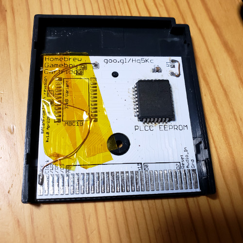 This is a half-success/half-failure: it does not work as a GB cartridge (it might, but the form factor is failed so can't even plug it), but it does work fine as an PLCC32 EEPROM programmer! Use this program to drive it from your PC read/write EEPROMs.
